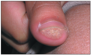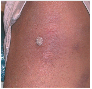 Case 2: This is a subungual/periungual wart, a keratotic papule that resists treatment. Subungual warts underlie and infiltrate the nail fold; periungual warts abut the nail fold. Subungual warts are more difficult to eradicate than other types of warts because a nidus of infected tissue remains after chemical or surgical treatment, which allows for reextension of the lesion.