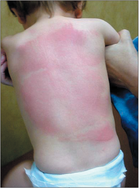 An otherwise healthy 10-month-old boy was brought to an allergy clinic for evaluation of atopic dermatitis and chronic rhinitis. On arrival at the clinic for aeroallergen and milk prick skin testing, a rash was noted that was different from his usual atopic dermatitis. The rash had not been present 2 hours earlier when the mother dressed the child and placed him in his car seat during the ride to the clinic.