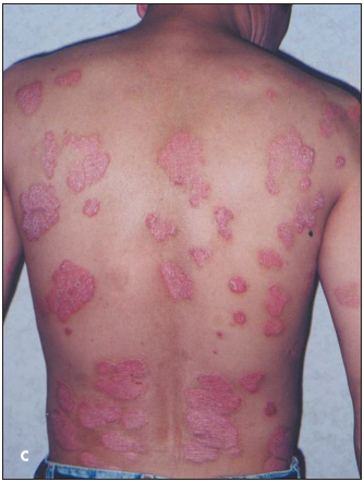 A 13-year-old boy presented with an explosive eruption of numerous, small, round, erythematous, itchy plaques on his lower back and lower limbs of 2 weeks' duration (A). Some of the lesions were scaly. His nails were normal. There was no evidence of arthritis or joint deformity. He had a sore throat a month before the onset of the rash but did not seek medical attention. He was not taking any medication and had no history of joint pain or family history of skin problems.