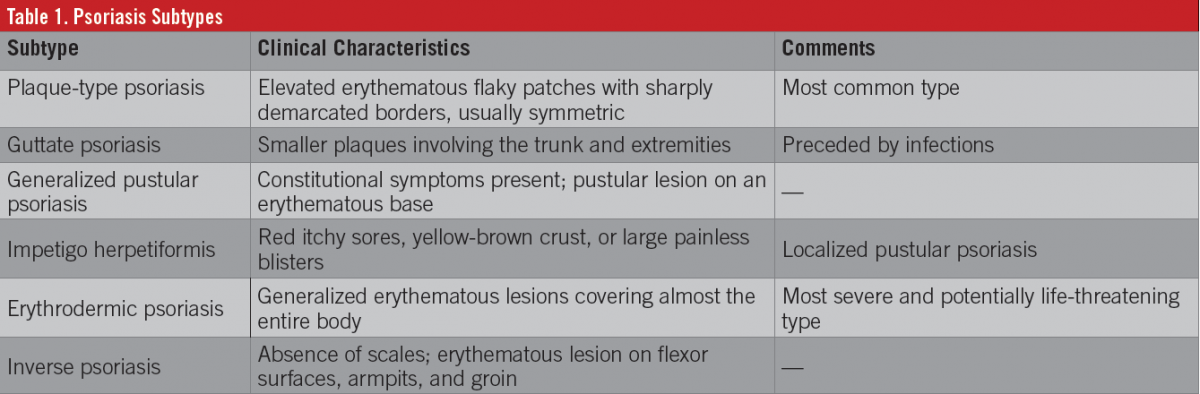 The most common subtype of psoriasis in the United States is plaque-type psoriasis, affecting approximately 80% of patients diagnosed with psoriasis. Plaque psoriasis has a predilection for the hairy scalp, the extensor surfaces of the elbows and knees, and the gluteal cleft.6 Other types of psoriasis occur less frequently and may have a different distribution and characteristic lesion (Table 1).