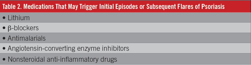 Infections, such as with β-hemolytic streptococci and human immunodeficiency virus, have been associated with the development of psoriasis, be it a causal or incidental association. Whether infection plays a crucial role in the development of psoriasis or whether it is directly involved in the vascular damage that occurs with psoriasis has not been extensively studied.7 Stress, tobacco use, infections, alcohol use, hormones, skin trauma, and possibly medications have been implicated in triggering first occurrences or subsequent outbreaks of psoriasis (Table 2).8,9