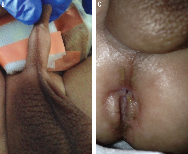 On physical examination, the patient had a temperature of 38.2°C, heart rate of 140 beats/min, respiratory rate of 35 breaths/min, and blood pressure of 87/47 mm Hg. Bilateral polythelia on the midclavicular line, abdominal distension (A), a hyperpigmented perineal raphe (B), and an abnormal opening anterior to imperforate anal sphincter musculature (C) were noted.
