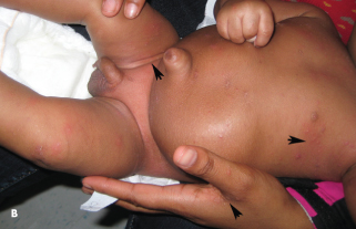 On examination, the infant had a generalized papular, nodular rash that was especially prominent on the neck, axilla, wrist, ankle, and genital area (A and B). Some of the lesions were rather large and erythematous. The mother had a papular, vesicular rash and multiple excoriation marks on her torso and shoulder. Some of the lesions showed early linear tracks and had ulcerated (C).