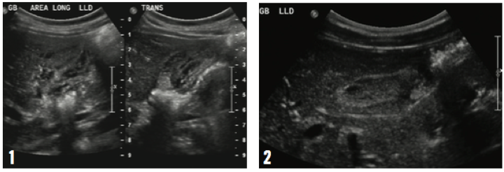 Ultrasonography of the abdomen revealed a necrotic gallbladder with thickened wall, septations, and pericholecystic fluid. However, there were no stones, and the appearances of the liver and spleen were unremarkable (Figure 1). The boy was treated symptomatically with hydration, pain control with acetaminophen, and a vegetarian diet. He improved after several days in the hospital, and 2 weeks after discharge his liver enzyme and bilirubin levels were within reference ranges, and repeat ultrasonography results were unremarkable.