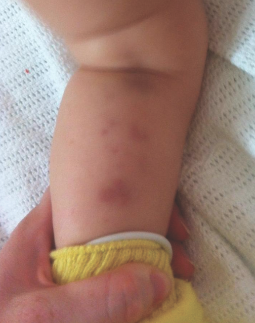 In the emergency department, physical examination revealed a stable but ill-appearing infant with petechiae and nonpalpable purpura ranging from 6 to 12 mm scattered over both lower extremities, most prominently over the extensor surfaces of her lower extremities and the soles of the feet. New petechiae also were noted along the infant’s neck and cheek and over the labia. There was no conjunctivitis, pallor, mucous membrane change, lymphadenopathy, organomegaly, mottling, or active bleeding from any site. Physical examination findings were otherwise unremarkable.