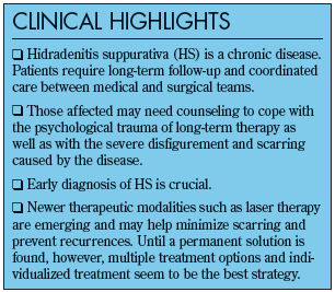 Therapy for patients with HS is multidisciplinary. Most patients eventually need both medical and surgical management. Treatment modalities can be described in 2 phases.