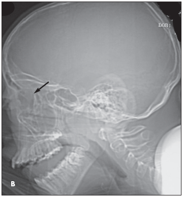 Intraorbital abscess: The radiographs demonstrate opacity of the ethmoid air cells on the left (A and B, blackarrows) with increased opacity of the left maxillary antrum, which is best seen on the frontal view (A, red arrow). The sphenoid and frontal sinuses are unremarkable. The increased density seen on the films results from the filling of the normally aerated sinuses with opaque material (in this case, mucus).