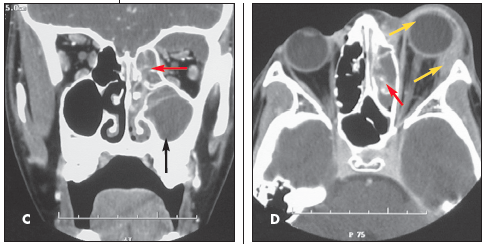 Coronal (C) and axial (D) CT images confirm the radiographic findings of opacity of the ethmoid air cells (red arrows) and maxillary antrum (black arrow) caused by mucus and fluid. These images also define the extent of orbital edema and proptosis (yellow arrows).