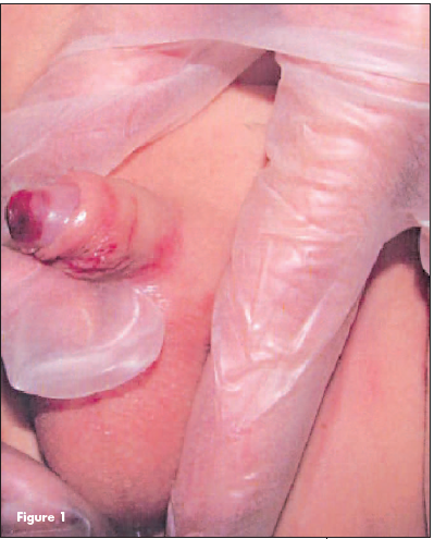 A 7-month-old male infant was brought to the emergency department (ED) by his biological mother, who reported noticing dried blood on the baby's penis and in his mouth. For several hours prior, he had been in the care of her boyfriend. On physical examination, there were severe ecchymoses and petechiae on the penile glans and shaft (Figure 1), ecchymoses on the right side of the soft palate, a laceration of the lingular frenulum, and a 2-cm bruise with dried blood over the right lip.