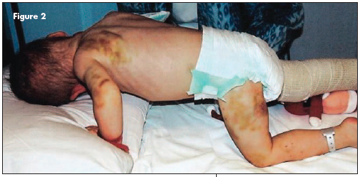 On physical examination, the child was noted to be malnourished, pale, and apathetic with multiple bruises and abrasions that were too numerous to count on the forehead, bilateral cheeks, anterior chest, torso, lower back, all 4 extremities, inner thighs, and genitals (Figure 2). Multiple curvilinear marks were visible on the chest (Figure 3), and unusual abrasions were seen on the inner thighs. The left upper extremity and right lower extremity exhibited tenderness and decreased range of motion. After initial stabilization and treatment, the child was transferred to a nearby university hospital and admitted for further care.