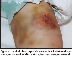 Figure 4 – A child abuse expert determined that the lesions shown here were the result of skin tearing when duct tape was removed.