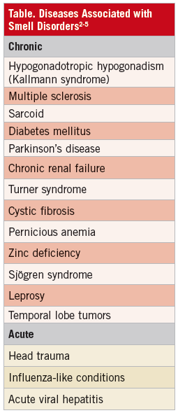 Measuring the exploration of the olfactory nerve’s function consists of letting examinees sniff nonirritating substances, such as cloves, cinnamon, mint, or coffee beans, with their eyes closed, 1 nostril at a time. Although a standard is not clearly defined, it is expected to find people that smell more than others (hyperosmia), somewhat less (hyposmia), or not at all (anosmia).3 These changes can be acute—many times reversible—or chronic. Some of the ailments associated with hyposmia or anosmia are presented in the Table. It is important to acknowledge that the ability to detect a smell is more relevant than identifying the substance.4
