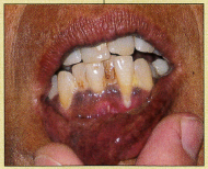 After further questioning, the patient reported that she had lost 87 to 95 lb over the past 2 to 3 years. A focused physical examination revealed the hyperpigmentation of Addison disease. (The Figure shows hyperpigmented gingiva in another patient with primary adrenal insufficiency). This patient’s insulin and C-peptide levels were undetectable, a finding consistent with the diagnosis of Addison disease. Because endogenous insulin secretion was not responsible for the hypoglycemia, it was suppressed. The culprit was a lack of adrenal production of steroids.