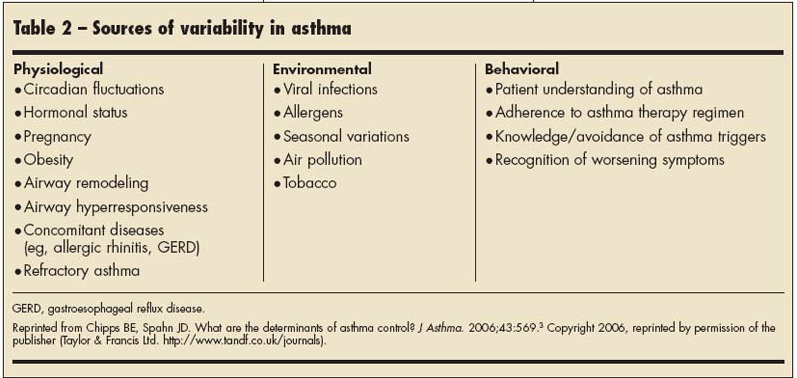 and adults, and this variation is probably more dependent on age than on symptoms."1 Indeed, an analysis of 5 double-blind, randomized, 12-week trials in children aged 4 to 11 years (N = 276) who were previously treated with short-acting b2-adrenergic agonists (SABAs) and subsequently randomly assigned to the placebo maintenance arm for any of these studies, demonstrated that these children frequently change severity categories: in more than 35%, severity changed more than 15 times.4 This study provides evidence of the limitations of classifying asthma based solely on severity, which can change over time.