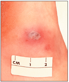 Figure 4 – Among the myriad manifestations of disseminated gonococcol infection are necrotic pustules that primarily involve the distal extremities. (Courtesy of the CDC/Dr Wiesner) |