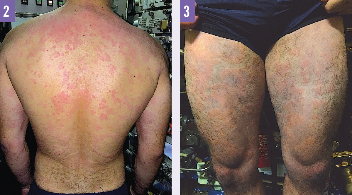 Physical examination. On physical examination, the man’s arms, back, chest, and thighs demonstrated diffuse, erythematous, raised, circumscribed plaques and swelling; the skin was otherwise clean and intact.
