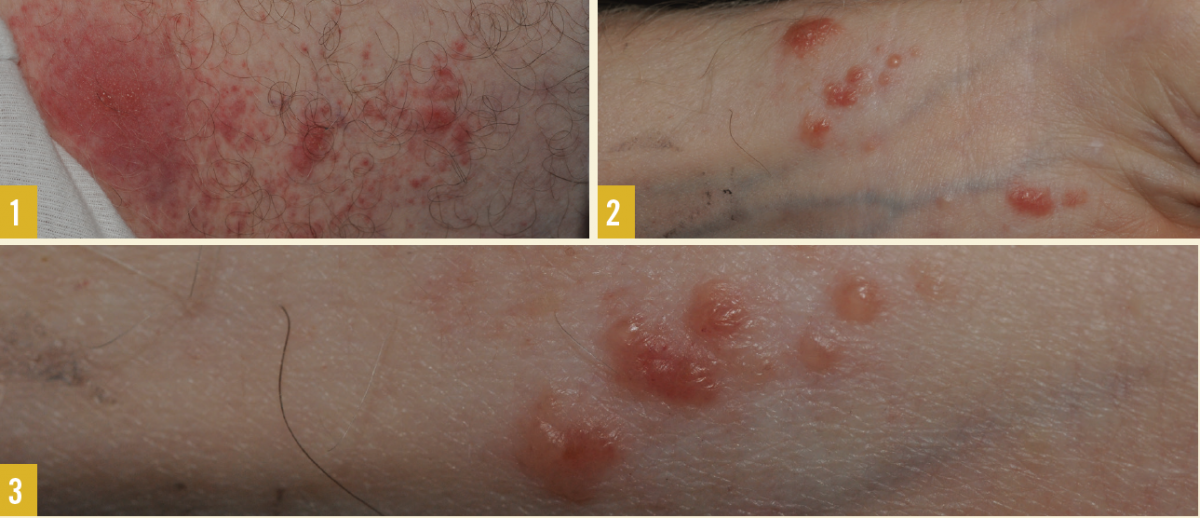 A delayed drug reaction would be expected to be more widespread and pruritic. Bullous impetigo is a concern, but again one would expect more crusting and fewer intact blisters on the man’s arm. Bullous pemphigoid is very pruritic, but the only symptom reported here was tenderness.