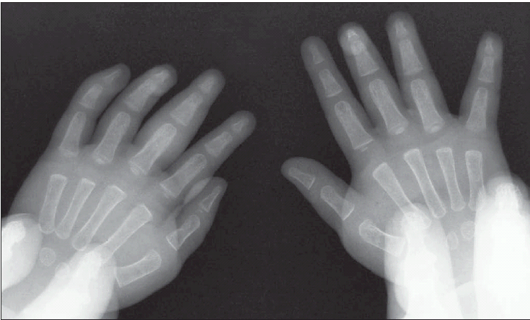 Radiograph of hands is shown.