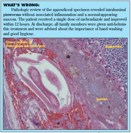 Pinworms are usually harmless. Most commonly, they cause anal pruritus.1 However, serious complications--such as enterocutaneous fistulae,2 urinary tract infections,3 and salpingitis4--can occur. Schoolchildren are at highest risk for pinworm infections: this helminthic infestation has been reported in 0.2%5 to 2.4%6 of children presenting with apparent appendicitis. In appendiceal specimens removed because of symptoms of acute appendicitis, pinworms were found more frequently in girls (4.6%) than in boys (1.9%).7,8 A recent study showed that 1.4% of the appendiceal specimens removed for various diagnoses contained pinworms.8
