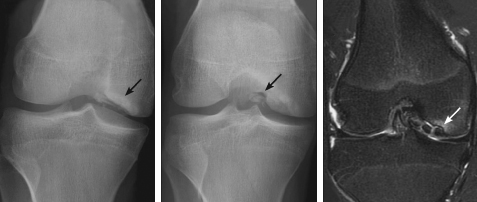 The radiographs show an osteochondral defect in the lateral aspect of the medial femoral condyle with intraarticular loose bodies. MRI of the knee, to delineate the extent of the lesion, shows an unstable, stage 4 osteochondral defect that involves the distal medial femoral condyle with at least 3 intraarticular loose bodies. In addition, there is small knee joint effusion with changes of mild synovitis.