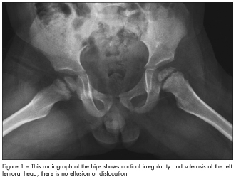 This patient’s radiographs showed cortical irregularity and sclerosis of the left femoral head, without effusion or dislocation (Figure 1). Because these findings may also represent Legg-Calvé-Perthes disease, MRI was performed to confirm the diagnosis of Meyer dysplasia (Figure 2).
