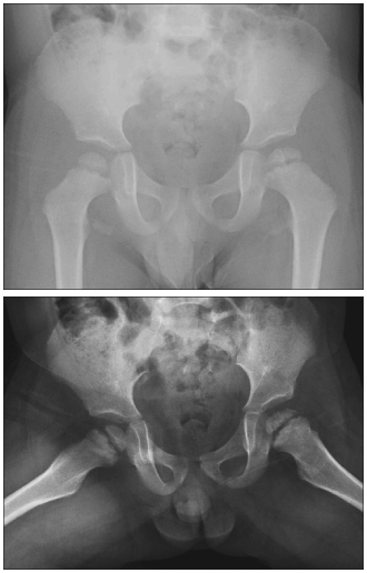 Meyer dysplasia, also known as dysplasia epiphysealis capitis femoris, is a developmental disorder of the hip manifested by delayed irregular ossification of the femoral epiphysis. The dysplasia most frequently develops in children aged 2 years and usually resolves by age 6 years without any treatment.1 This rare condition can be easily mistaken for other disorders of the hip, in particular Legg-Calvé-Perthes disease (idiopathic osteonecrosis or avascular necrosis of the capital femoral epiphysis).