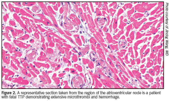 The pathophysiologic hallmark of TTP is the presence of large von Willebrand factor (vWF) multimers and low levels of ADAMTS13, the protease that normally cleaves vWF multimers into the “right size.”2 In the absence of adequate ADAMTS13 activity, abnormally large vWF multimers are more easily accumulated and cause intravascular vWF-platelet aggregation and microvascular thrombosis.3