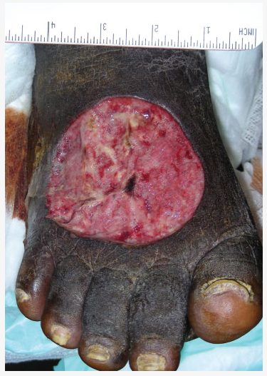 This painful, purulent, malodorous, 5 x 5-cm ulcer developed a few days after the 71-year-old patient had struck his foot against a radiator. For the past 24 hours, he had subjective fevers and chills. He denied recent travel and saltwater or freshwater exposure. He had chronic lymphedema and admitted to drinking alcohol socially.