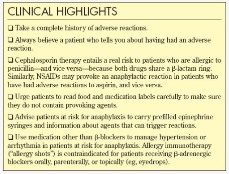 ABSTRACT: Various practical measures can prevent most episodes of anaphylaxis. Display information about previous adverse reactions prominently in the patient’s chart. If a patient reports allergy to a medication, use an alternative. Whenever possible, give antibiotics orally rather than parenterally; if parenteral therapy is required, have patients wait for a half hour in your office after the injection. Always keep the medications and equipment necessary to treat anaphylaxis on hand. Warn patients not to withhold anaphylaxis treatment when needed, and urge them to discard any unused medication or food to which they have reacted.