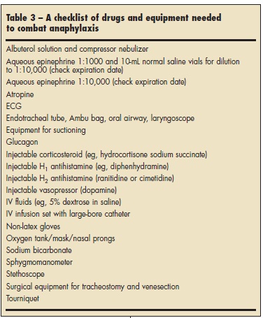 Most reactions can be detected early and can be stopped quickly by properly used epinephrine and antihistamines. In any office where you give injections (eg, medication, vaccinations, or allergy shots), keep a variety of items for treatment of anaphylaxis on hand (Table 3).