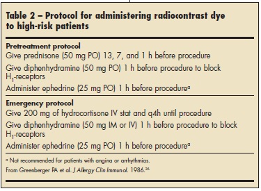 The likelihood of a recurrent anaphylactic reaction to a radiocontrast medium can be dramatically reduced by using such protocols. Since the incidence of severe reactions (dyspnea, sudden hypotension, cardiac arrest, and/or loss of consciousness) is lower with low osmolar nonionic media,25 some authors strongly recommend the use of such media along with pretreatment protocols in patients who have had previous immediate reactions. Table 2 provides a pretreatment protocol recommended by Greenberger and colleagues.26