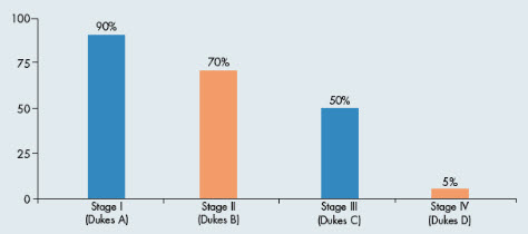 Increased understanding of the molecular and biologic characteristics of CRC has provided useful insights into the pathogenesis and primary prevention of colonic neoplasms. Because these cancers develop over long periods, preneoplastic and early neoplastic lesions can be detected earlier, thus improving survival rates (Figure 1). Despite the reduction in morbidity and mortality with regular screening and surveillance, screening rates remain low. In 2001, the CDC Behavioral Risk Factor Surveillance System estimated that only 53.1% of persons older than 50 years had undergone a fecal occult blood test (FOBT) in the past year or a screening colonoscopy in the past 10 years.2,3