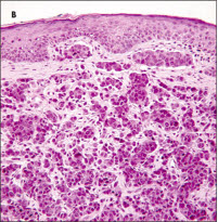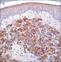 Histopathological examination of a shave biopsy specimen from the nodule revealed adenocarcinoma in the dermis with an intact overlying epidermis (B). In view of the patient’s history, metastasis from the primary carcinoma in the prostate was considered the most likely diagnosis. Immunohistochemical staining with the antibody to prostate-specific antigen confirmed prostatic adenocarcinoma (C).