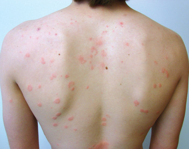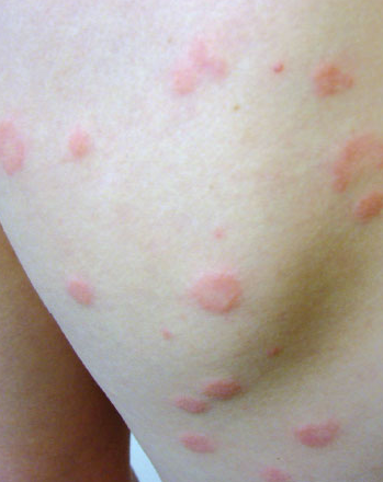 For 2 days, a 17-year-old boy had a widespread pruritic eruption that involved the trunk and extremities but spared most of the face. Many of the lesions were annular, and they would appear and resolve within 1 day. The patient denied shortness of breath, difficulty in swallowing, and periorbital swelling.