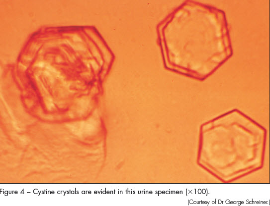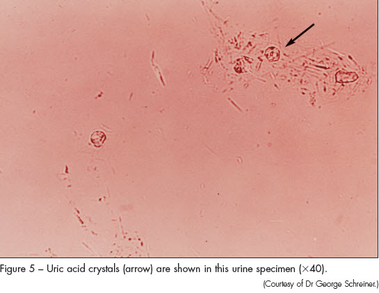 The urinary sediment—cells, casts, and crystals—can also point to specific renal pathology. The presence of red blood cells (RBCs), especially dysmorphic ones, and RBC casts (Figure 1) suggests a “nephritic” glomerulopathy (Table). An example of a nephritic process might be vasculitis with glomerular involvement as may occur in RPGN. Abundant white blood cells (WBCs) in urinary sediments (Figure 2) can point to infection (such as pyelonephritis) or drug-induced interstitial nephritis. Crystals (eg, oxalate [Figure 3], cystine [Figure 4], uric acid [Figure 5]) can suggest stones in the setting of pain or obstruction found on an ultrasound scan.