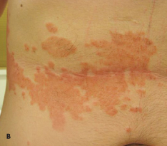 A 29-year-old prisoner with a history of plaque psoriasis complained of herpes zoster (shingles) of 2 months’ duration. He had experienced a sudden onset of right-sided chest and back pain that evolved into a red rash with blisters. The pain resolved, but the rash persisted (A, B). A review of systems was otherwise negative.
