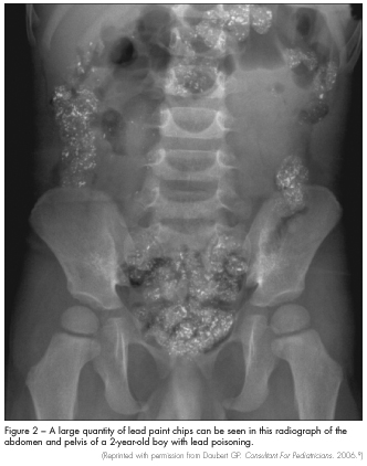 Imaging studies. Abdominal radiography may show the presence of radiopaque flakes, which is a clear indicator of pica (Figure 2). Radiographs of the long bones may show “lead lines.”2 Lead lines—which are abnormal calcium deposits, not actual lead deposition—may be detected at the distal metaphysis in children with lead levels greater than 45 µg/dL; these represent growth arrest associated with long-term lead exposure. This radiological finding is not required for diagnosis. Head CT scanning may be needed in patients who present with altered mental status to exclude cerebral edema and structural lesions.