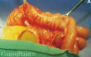 An upper GI tract series is the study of choice and may help reveal the abnormal position of the duodenojejunal junction and duodenal obstruction. This abnormality has a characteristic “corkscrew,” “coiled,” or “bird’s beak” appearance (C). Early surgical intervention is imperative in a symptomatic patient to minimize the risk of midgut gangrene. Preoperative measures include intravenous hydration to restore fluid and electrolyte balance, nasogastric suction, and intravenous antibiotics (because a bowel resection may be necessary). The procedure of choice—the Ladd procedure—includes evisceration of the midgut and inspection of the mesenteric root, counterclockwise derotation of the volvulus, division of Ladd bands from the cecum across the duodenum, appendectomy, and placement of the cecum in the left lower quadrant. The appendectomy is performed because the cecum is located in an atypical position, which makes a future diagnosis of appendicitis difficult.
