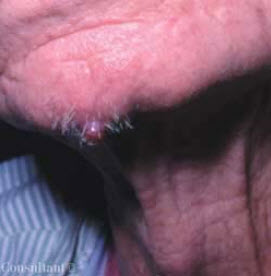 The sudden appearance of an asymptomatic, 6 x 4.5-mm, exophytic, red nodule on the chin prompted an ostensibly healthy 73-year-old nonsmoker to seek medical attention. His nodes were not enlarged, and he had no other skin lesions.