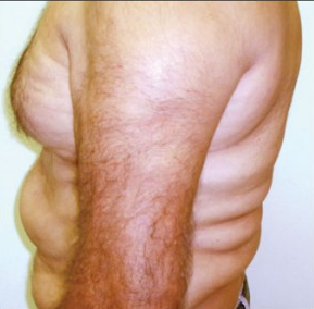 MSL has been divided into 3 types: type 1 involves the neck region; type 2 involves the entire upper trunk, including chest and shoulders, which creates a pseudoathletic appearance—as seen in this patient; and type 3 primarily involves the thighs (gynecoid type).