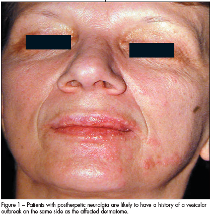 Unlike the pain of burning mouth syndrome, the pain of PHN is unilateral and restricted to the appropriate dermatome. The history is likely to include a previous vesicular outbreak on the ipsilateral side (Figure 1). However, if the primary lesions occur in the mouth with minimal facial involvement (a rarer variation that affects the second and third division of the fifth cranial nerve), the patient may not be aware of the connection between the postzoster pain and the original episode. Hence, it is important to ask whether the current pain was preceded by an eruption of multiple painful intraoral vesicles that lasted 14 to 21 days.