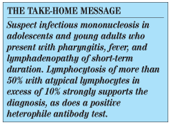 Outcome of this case. A peripheral blood smear examination revealed that the percentage of atypical lymphocytes was 20%. A monospot test was positive, while a throat swab showed normal flora. The patient’s condition slowly improved, and she was afebrile with resolving pharyngitis by week 2. She slowly regained her strength and returned to school by week 4. By week 6, all symptoms and signs, including the splenomegaly and lymphadenopathy, had resolved. ■