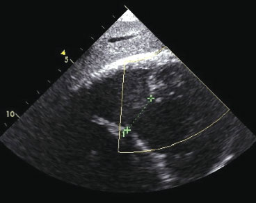 Twelve hours after admission, the patient had hypotension, atrial fibrillation, and worsening respiratory distress. ST-segment elevation also developed in the inferior leads on a 12-lead ECG. A repeated 2-dimensional transthoracic echocardiogram showed inferior wall hypokinesis, along with a ventricular septal defect (VSD) in the inferoseptum (shown here). Within 24 hours of admission, the patient sustained a cardiac arrest. Efforts to resuscitate her were unsuccessful.