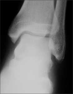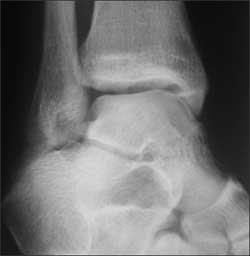 A 29-year-old man presents with right ankle pain caused by a basketball injury he sustained 1 day earlier. He fell after he had jumped up and landed on another player’s foot. The patient’s foot was “turned in” during the fall; this position indicates an inversion injury. He says he has injured his ankle before but never this severely. The rest of the medical history is noncontributory.