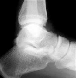 The well-corticated ossific fragment is consistent with an old injury, but it is in the region that is now extremely tender. The joint effusion indicates that the current injury is severe. However, this is a nonspecific finding; joint effusions are seen with fractures and ligament and tendon injuries.