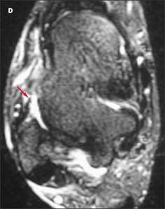 Because the patient’s pain is severe, you order an MRI scan to further evaluate the injury. A T2-weighted axial image reveals disruption of the anterior talofibular ligament (D, red arrow).