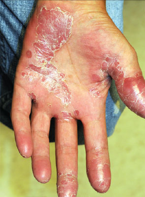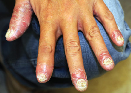 The lesions of contact dermatitis are less well-defined than those of psoriasis. Lichen planus is less scaly than psoriasis. Palmar keratoderma is generally not erythematous. RA is in the differential of psoriatic arthritis; the presence of psoriatic skin and nail lesions in this patient suggested the latter diagnosis. Laboratory tests can differentiate RA from psoriatic arthritis.The presence of scaly erythematous plaques, subungual hyperkeratosis, and onycholysis pointed to the diagnosis of psoriasis, A, with psoriatic arthritis and dactylitis. Because treatment with methotrexate or cyclosporine was not an option for this patient, he elected to use an injectable biologic agent, and his condition significantly improved. It is important to be aggressive to minimize the development of destructive joint changes and to coordinate care with a rheumatologist if you are not comfortable with the various treatment options. The sudden onset of psoriasis with dactylitis would also suggest the need to test for HIV infection because there is an association between the two conditions.
