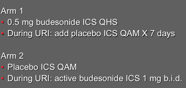 The 2011 Maintenance and Intermittent Inhaled Corticosteroids in Wheezing Toddlers (MIST) trial followed 213 children (aged 12-53 months) who were randomly assigned to 2 groups. Children in the first group were given an ICS (budesonideevery night for 1 year, while children in the second group were given a placebo every night for 1 year and an ICS only during flare-ups.1