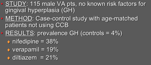 Using a case-control methodology, researchers found that the relative risk of gingival hyperplasia was 5 to 10 times greater in patients treated with nifedipine, verapamil, or diltiazem than patients not receiving calcium channel blockers.