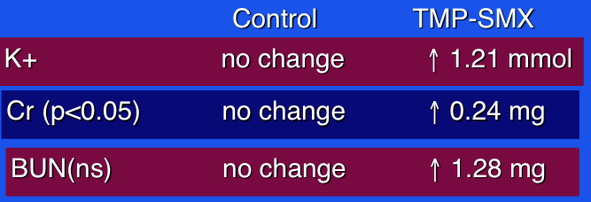 In order to elucidate the relationship between standard dose TMP-SMX and hyperkalemia, researchers compared potassium levels in persons taking TMP-SMX (<320/1600 mg/d) with study subjects who had received other antibiotics.